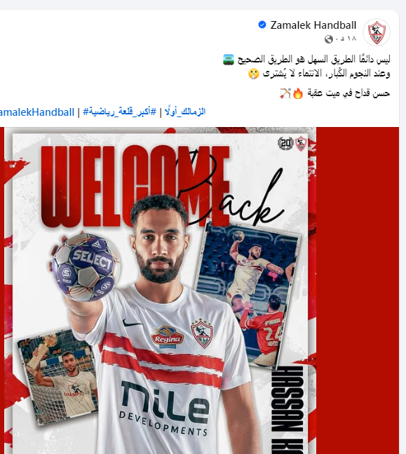 ونشرت الصفحة الرسمية لنادي الزمالك لكرة اليد اعلان ضم قداح وكتبت التالي: