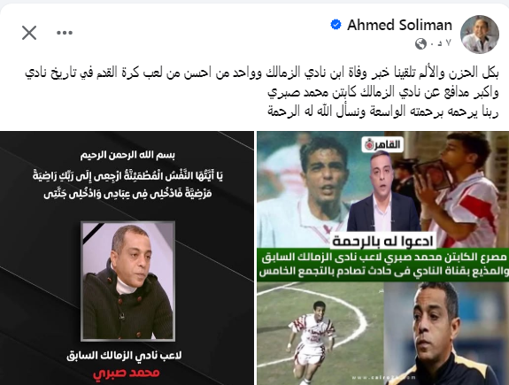 حرص أحمد سليمان عضو مجلس ادارة نادى الزمالك على نعى محمد صبرى نجم الزمالك السابق، ومقدم برنامج زملكاوى على شاشة قناة النادى.