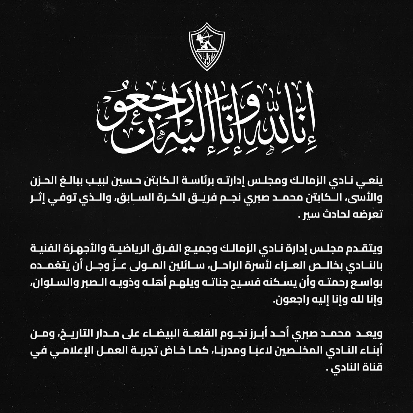 وتقدّم مجلس الإدارة وجميع الفرق الرياضية والأجهزة الفنية بالنادي بخالص التعازي لأسرة الفقيد، داعين الله أن يتغمّده برحمته الواسعة، ويسكنه فسيح جناته، ويلهم أهله ومحبيه الصبر والسلوان.