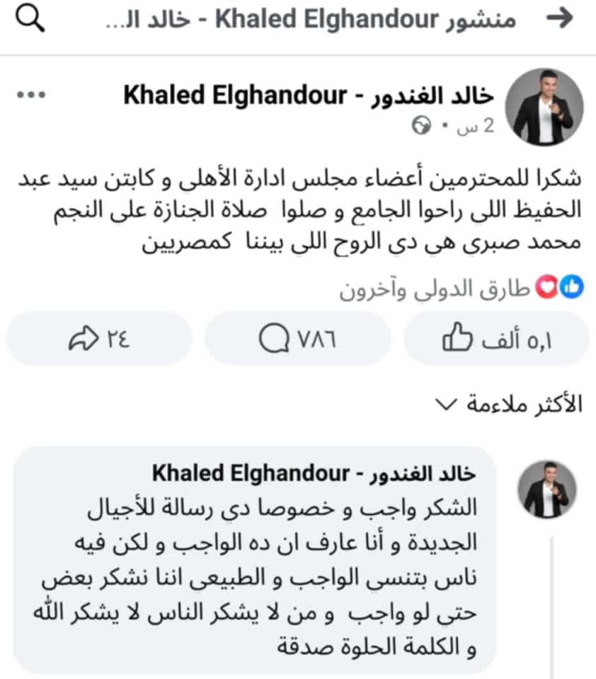 وجه الاعلامي خالد الغندرور نجم الزمالك السابق رسالة شكر الى أعضاء مجلس ادارة الأهلي و سيد عبد الحفيظ لحضورهم عزاء الراحل محمد صبري لاعب الزمالك السابق