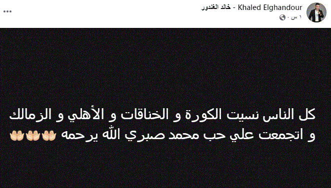 كل الناس نسيت الكورة و الخناقات و الأهلي و الزمالك و اتجمعت علي حب محمد صبري الله يرحمه "