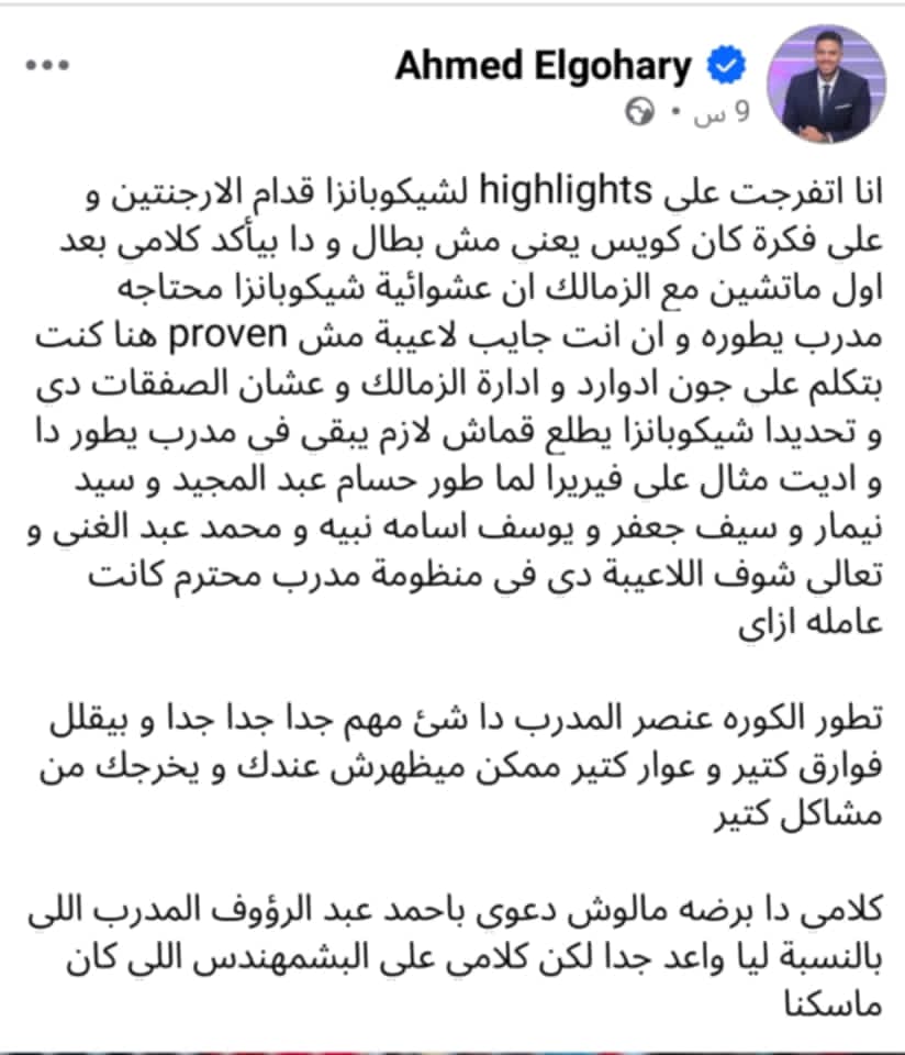 كلامي دا برضه مالوش دعوي باحمد عبد الرؤوف المدرب اللي بالنسبة ليا واعد جدا لكن كلامي علي البشمهندس اللي كان ماسكنا.