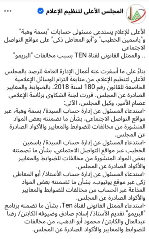 أصدر المجلس الأعلى لتنظيم الإعلام قرار باستدعاء عدد من مسؤولي الحسابات التابعة لشخصيات إعلامية معروفة على مواقع التواصل الاجتماعي.