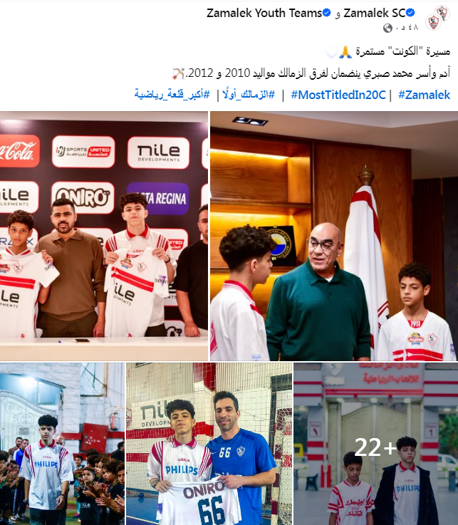 وأتمت إدارة قطاعات الكرة بالنادي إجراءات انضمام الثنائي لفرق الشباب، حيث انضم آدم محمد صبري لفريق مواليد 2010، فيما التحق شقيقه آسر بفريق مواليد 2012.