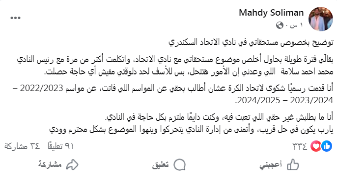 توضيح بخصوص مستحقاتي في نادي الاتحاد السكندري بقالّي فترة طويلة بحاول أخلص موضوع مستحقاتي مع نادي الاتحاد، واتكلمت أكتر من مرة مع رئيس النادي محمد احمد سلامة اللي وعدني إن الأمور هتتحل، بس للأسف لحد دلوقتي مفيش أي حاجة حصلت.