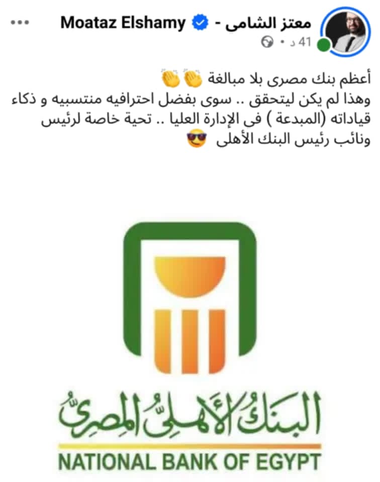 ونحن نعلم الاسباب، حرص معتز الشامى على الاشادة بادارة البنك، حيث كتب ..