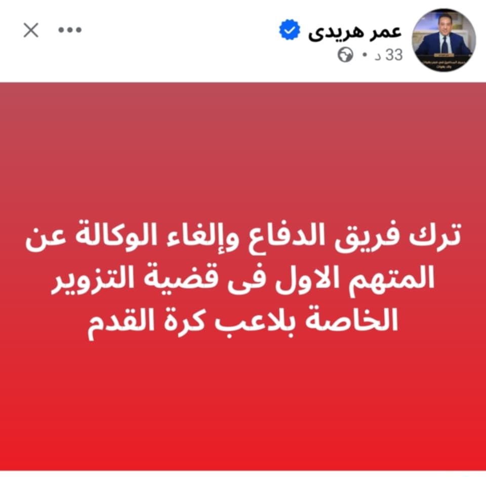 ترك فريق الدفاع وإلغاء الوكالة عن المتهم الاول فى قضية التزوير الخاصة بلاعب كرة القدم