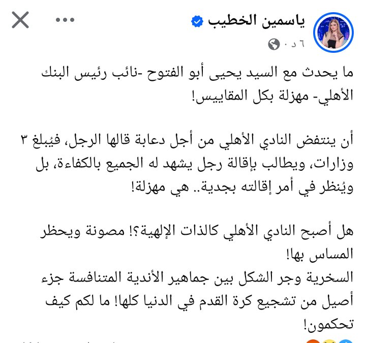 علقت المذيعة ياسمين الخطيب على الهيصة الفارغة التى يقوم بها النادى الاهلى ضد السيد يحيى أبو الفتوح نائب رئيس البنك الأهلي.