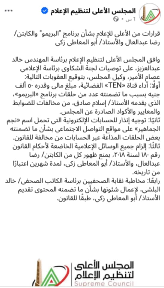 وفي إطار القرارات الأخرى، ألزم المجلس جميع الوسائل الإعلامية الخاضعة لقانون رقم 180 لسنة 2018 بعدم ظهور الكابتن رضا عبد العال والأستاذ أبو المعاطي زكي لمدة شهرين.