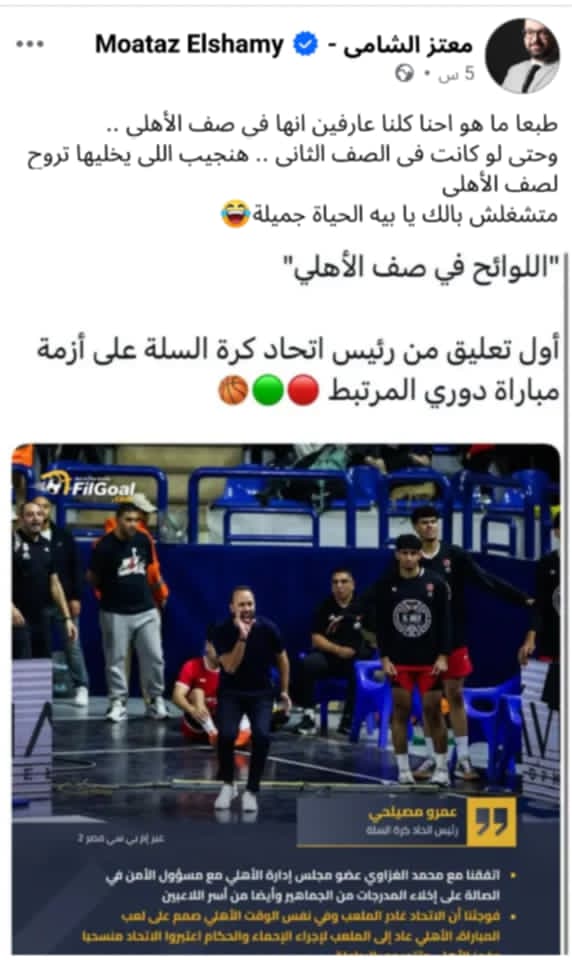 الازمة التى صدر فيها القرار بعد دقائق من الازمة، وخرج رئيس اتحاد السلة وأكد ان اللوائح لصالح الاهلى، حرص معتز الشامى التعليق على هذا التصريح.