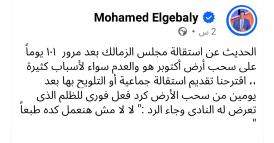 الحديث عن استقالة مجلس الزمالك بعد مرور ١٠١ يوماً على سحب أرض أكتوبر هو والعدم سواء لأسباب كثيرة ،،