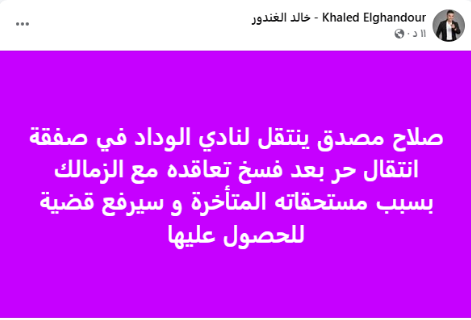 صلاح مصدق ينتقل لنادي الوداد في صفقة انتقال حر بعد فسخ تعاقده مع الزمالك بسبب مستحقاته المتأخرة، وسيرفع قضية للحصول عليها.