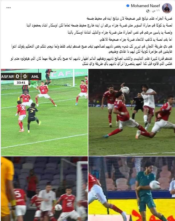 لمسة يد كوكا في مباراة السوبر مش ضربة جزاء برغم ان ايده خارج محيط جسمه تماما لكن اوسكار اشاد بمحمود البنا