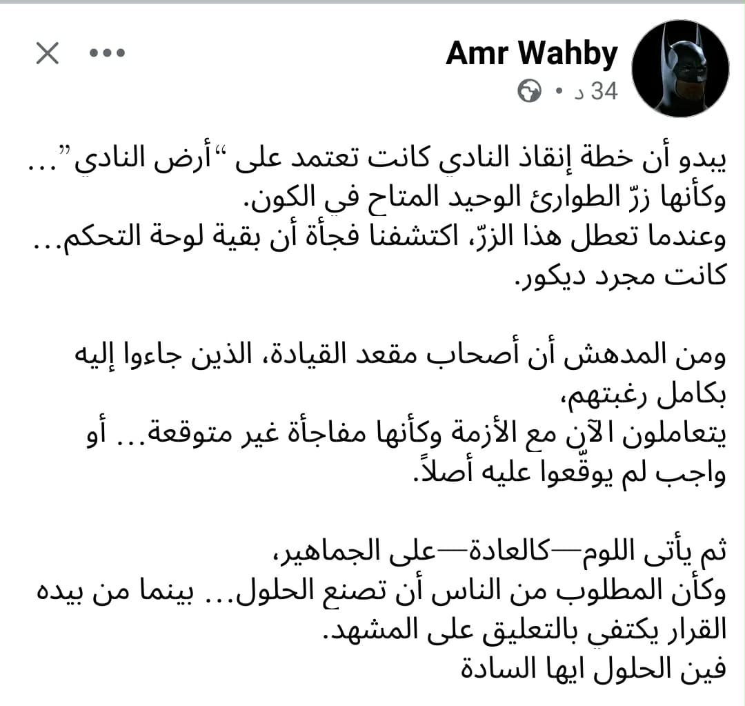 وعبر صفحته الشخصية على موقع التواصل الإجتماعي فيسبوك كتب عمرو وهبى قائلاً،