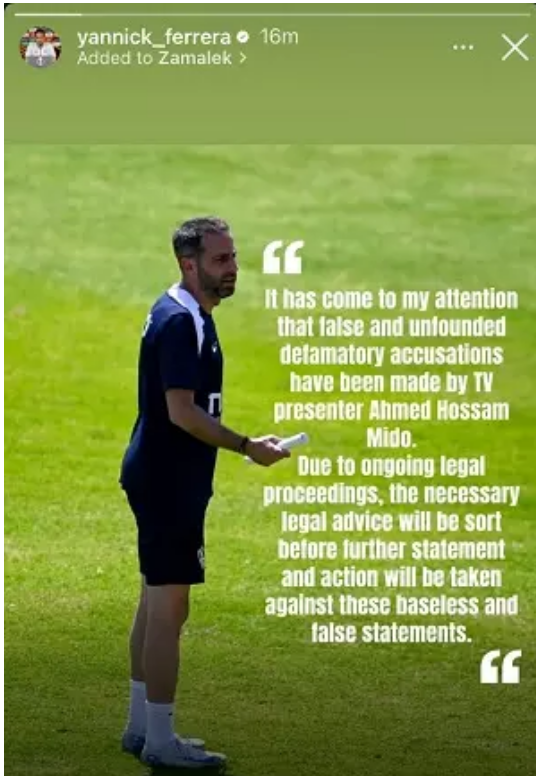 هذا التحرك القانونى ووفق فيريرا رداً على الاتهامات التي وُجهها إليه ميدو خلال الساعات الأخيرة.