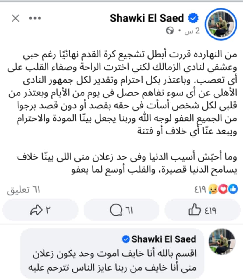 وباعتذر بكل احترام وتقدير لكل جمهور النادي الأهلي عن أي سوء تفاهم حصل في يوم من الأيام وبعتذر من قلبي لكل شخص أسأت في حقه بقصد أو دون قصد برجوا من الجميع العفو لوجه الله وربنا يجعل بينّا المودة والاحترام ويبعد عنّا أي خلاف أو فتنة.