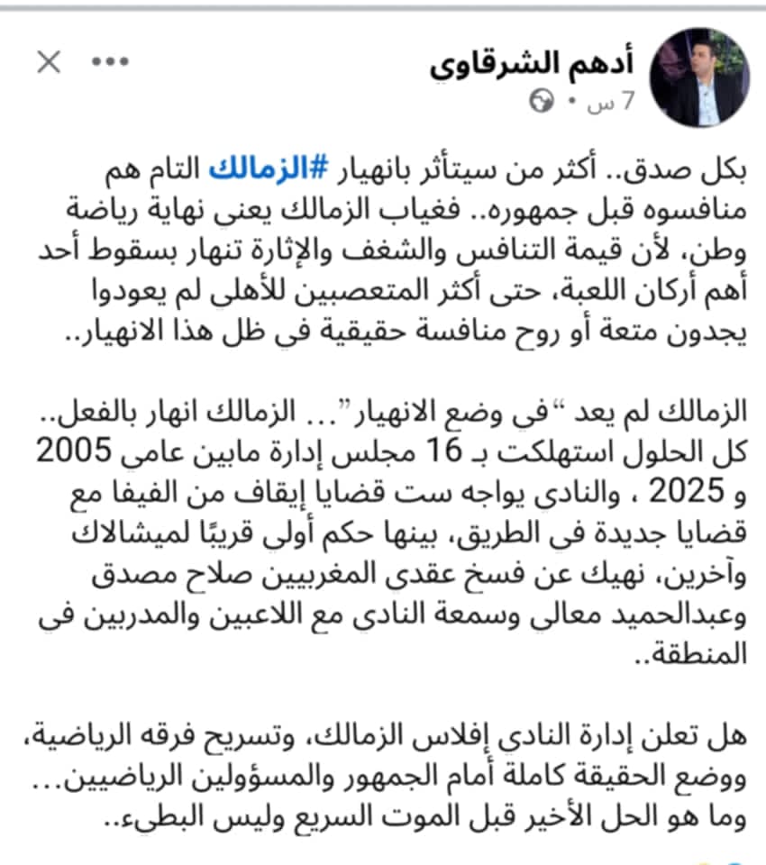 الزمالك لم يعد “في وضع الانهيار”… الزمالك انهار بالفعل.. كل الحلول استهلكت بـ 16 مجلس إدارة مابين عامي 2005 و 2025 ، والنادي يواجه ست قضايا إيقاف من الفيفا مع قضايا جديدة في الطريق، بينها حكم أولي قريبًا لميشالاك وآخرين، نهيك عن فسخ عقدي المغربيين صلاح مصدق وعبدالحميد معالي وسمعة النادي مع اللاعبين والمدربين في المنطقة..