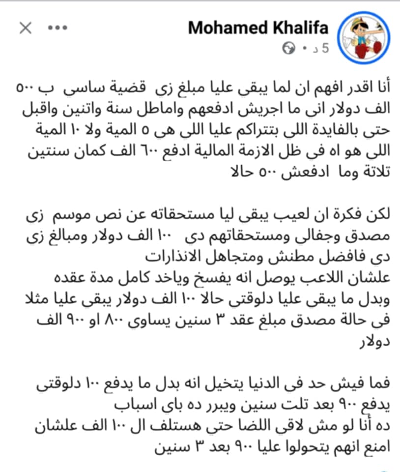 لكن فكرة ان لعيب يبقي ليا مستحقاته عن نص موسم زي مصدق وجفالي ومستحقاتهم دي ١٠٠ الف دولار ومبالغ زي دي فافضل مطنش ومتجاهل الانذارات