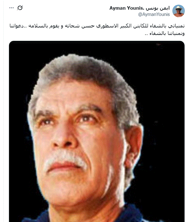 وجّه أيمن يونس، نجم الزمالك الأسبق، رسالة بشأن الحالة الصحية للكابتن حسن شحاتة، أسطورة الزمالك والمدير الفني التاريخي لمنتخب مصر.