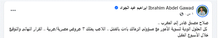 اوضح الاعلامى ابراهيم عبد الجواد، تطورات الازمه بين المغربي صلاح الدين مصدق مدافع الفريق الاول الكروى بالنادى، مع لزمالك.