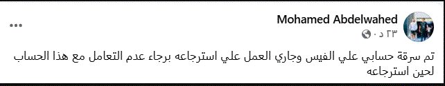 تم اختراق حسابي على فيسبوك، وجارٍ العمل على استعادته.. أرجو عدم التعامل مع أي محتوى يصدر من الحساب لحين استرجاعه بشكل كامل.