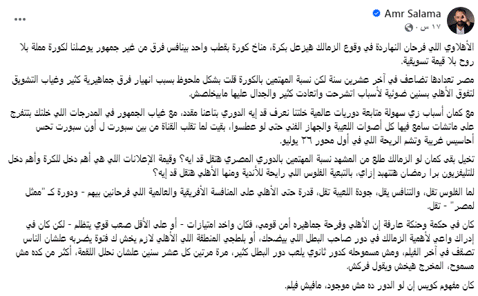 الأهلاوي اللي فرحان النهاردة في وقوع الزمالك هيزعل بكرة، مناخ كورة بقطب واحد بينافس فرق من غير جمهور يوصلنا لكورة مملة بلا روح بلا قيمة تسويقية.