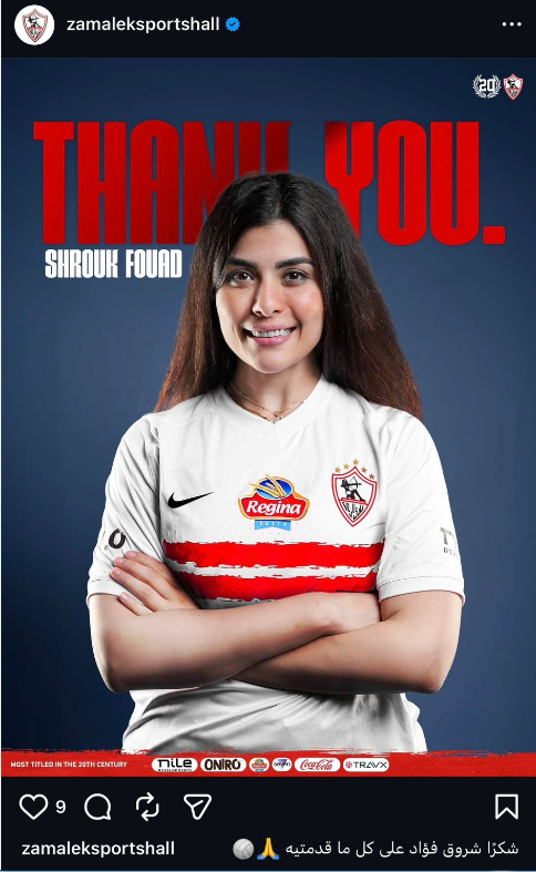 حرصت الصفحة الرسمية لألعاب الصالات بنادي الزمالك على توجيه الشكر للاعبة الفريق السابقة شروق فؤاد.