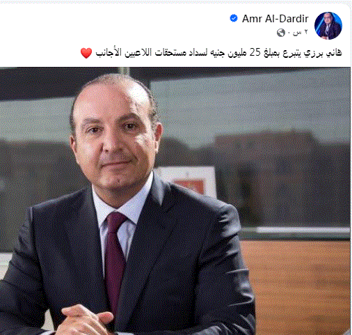وكتب عمرو الدردير من خلال حسابه على موقع التواصل الاجتماعي فيسبوك قائلا: