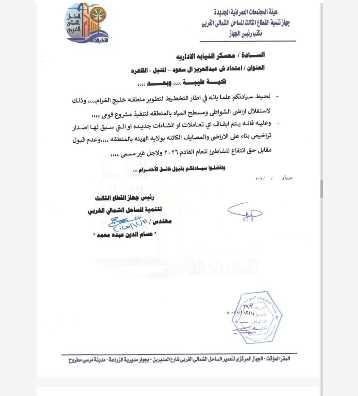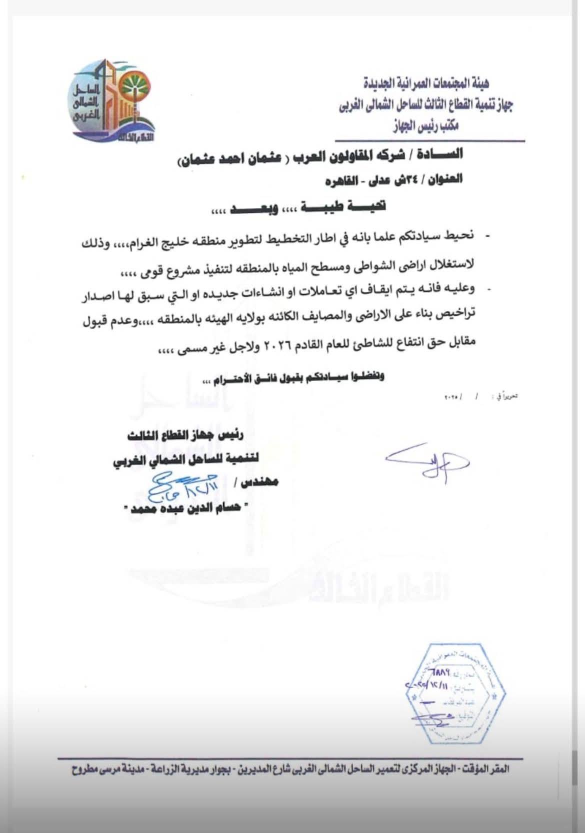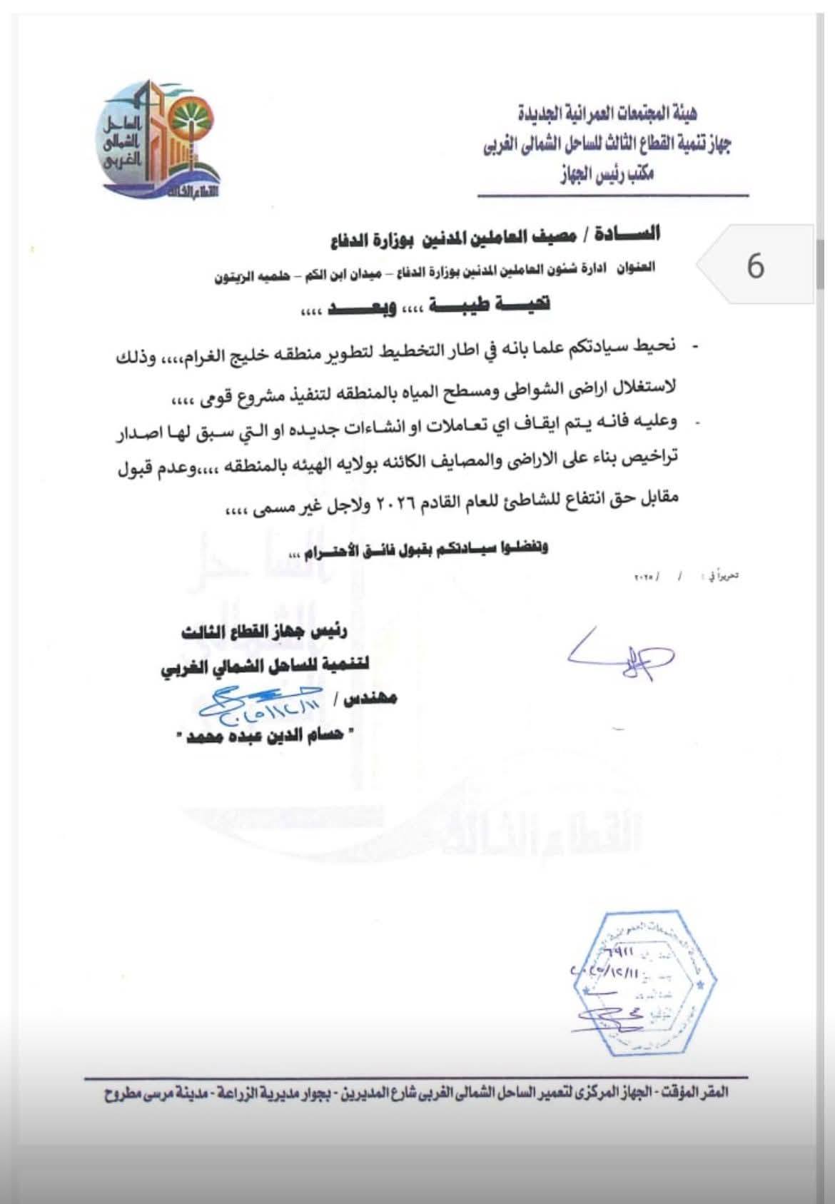 قررت هيئة المجتمعات العمرانية الجديدة سحب جميع قطع الأراضي الواقعة داخل نطاق منطقة التطوير في مطروح، وذلك ضمن خطة إعادة تنظيم واستغلال المنطقة بالشكل الأمثل.