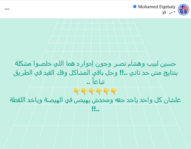 حسين لبيب وهشام نصر وجون إدوارد هما اللي خلصوا مشكلة بنتايج مش حد تاني ..!! وحل باقي المشاكل وفك القيد في الطريق تباعاً.