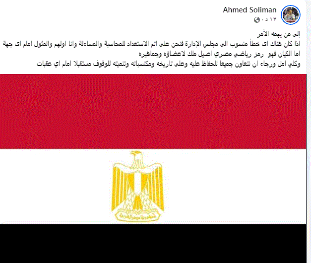 أحمد سليمان من خلال حسابه على موقع التواصل الاجتماعي فيسبوك كتب قائلا: