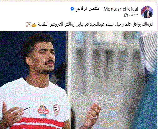 كشف الكاتب الصحفي منتصر الرفاعي عن موافقة نادي الزمالك على بيع اللاعب حسام عبد المجيد مدافع الفريق في يناير