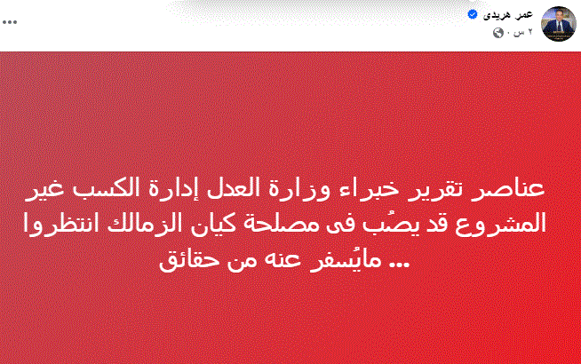 عناصر تقرير خبراء وزارة العدل إدارة الكسب غير المشروع قد يصُب فى مصلحة كيان الزمالك انتظروا ... مايُسفر عنه من حقائق