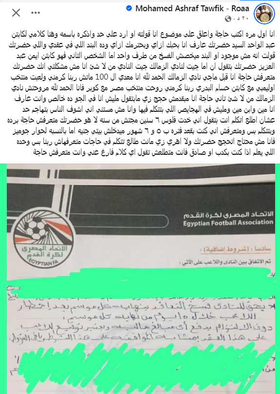 وده البند اللي في عقدي واللي حضرتك قولت انه مش موجود او البند ميخصش الفسخ من طرف واحد اما الشخص التاني فهو كابتن ايمن عبد العزيز حضرتك بتقول ان اما جيت لنادي الزمالك جيت النادي من لا شئ انا مش مشكلتي انك حضرتك متعرفش حاجة انا قبل ماجي نادي الزمالك الحمد لله انا معدي ال 100 ماتش.