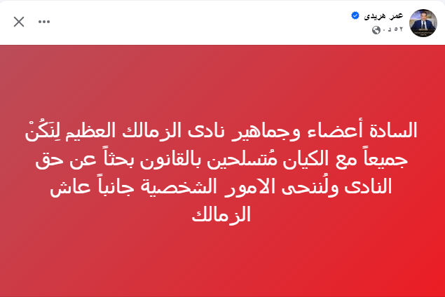 طلب عمر هريدى المرشح السابق على رئاسة الزمالك الجميع بالتكاتف الآن من أجل مصلحة نادى الزمالك.