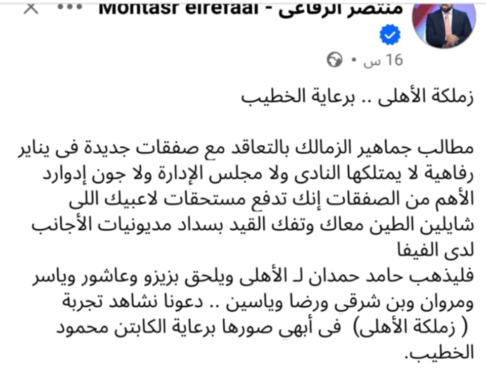 وعبر صفحته الشخصية على موقع التواصل الاجتماعي فيسبوك كتب منتصر الرفاعي معلقآ،