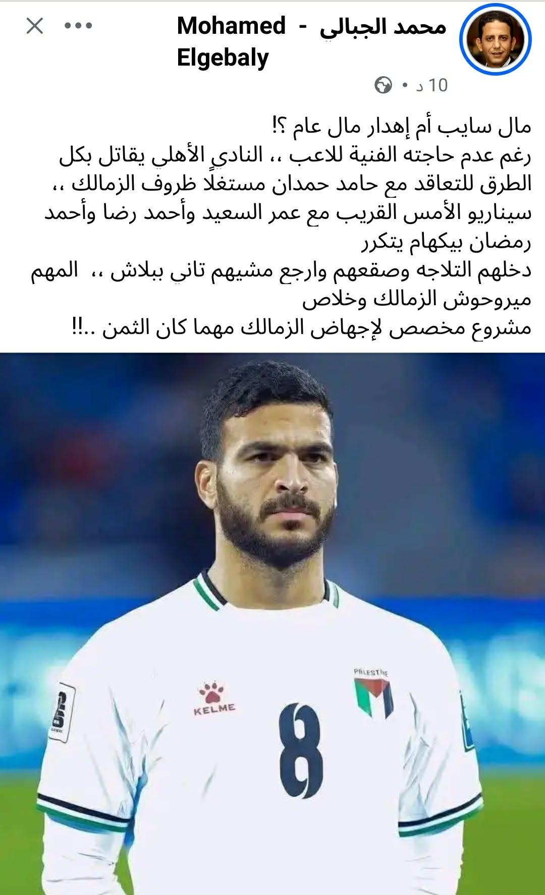 رغم عدم حاجته الفنية للاعب ،، النادي الأهلي يقاتل بكل الطرق للتعاقد مع حامد حمدان مستغلاً ظروف الزمالك.