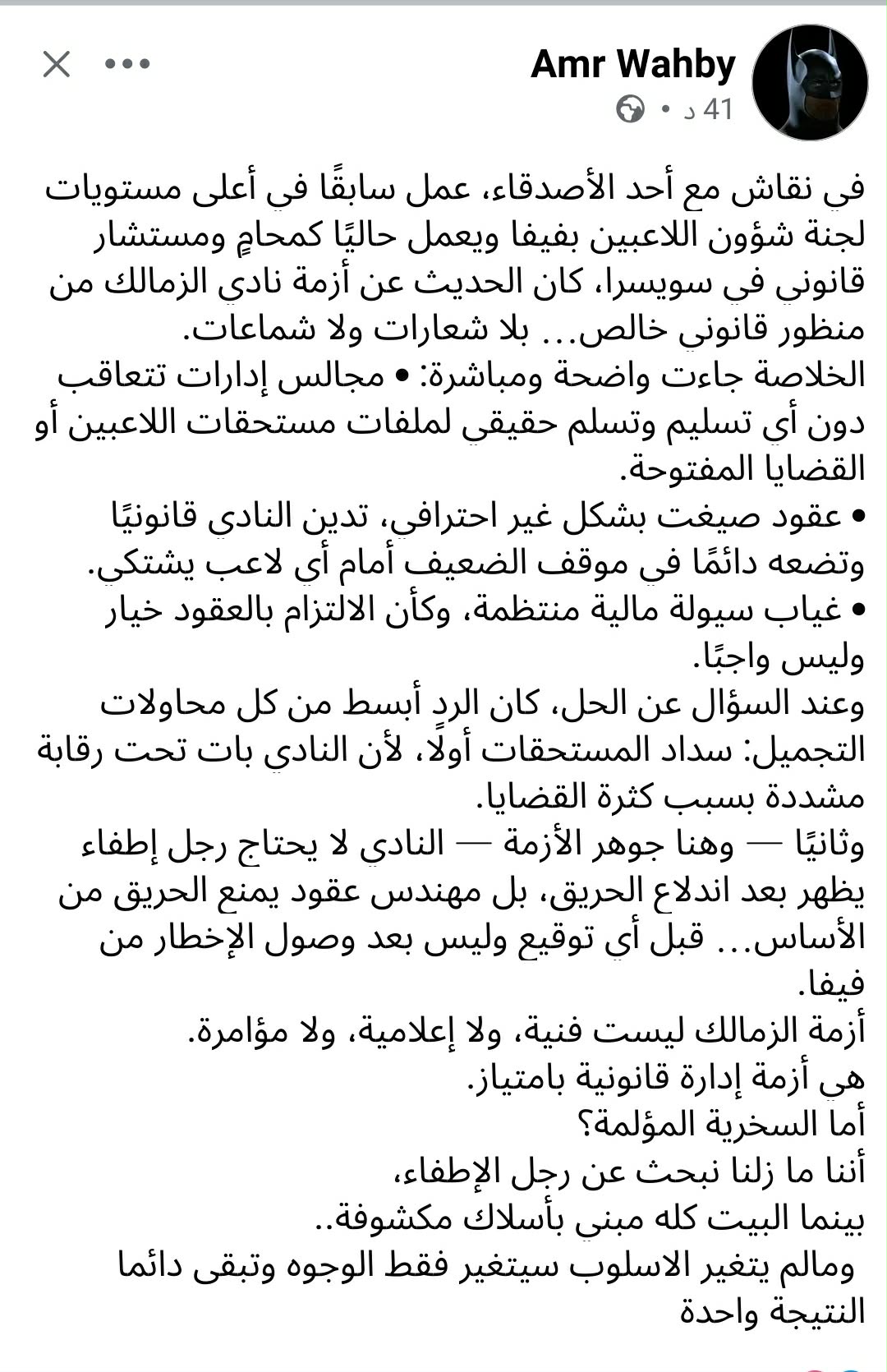 علق عمرو وهبى الذى كان مرشح لشغل منصب رئيس لجنة التعاقدات بنادي الزمالك على الموقف الصعب لنادي الزمالك داخل أروقة الفيفا.