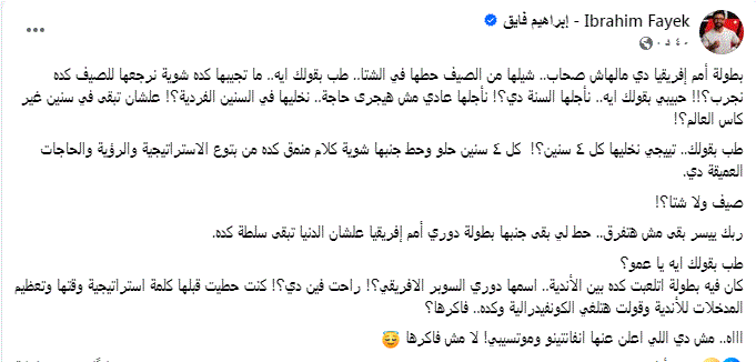 وكتب ابراهيم فايق من خلال حسابه على موقع التةواصل الاجتماعي فيسبوك قائلا: