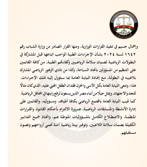 وأوضحت النيابة في بيانها الرسمي أن قرار الإحالة جاء نتيجة ثبوت الإهمال والتقصير في أداء الواجبات الوظيفية المكلفين بها، إضافة إلى الإخلال الجسيم بقواعد العمل، بما أدى إلى تعريض حياة الأطفال المشاركين في بطولة الجمهورية للسباحة للخطر.
