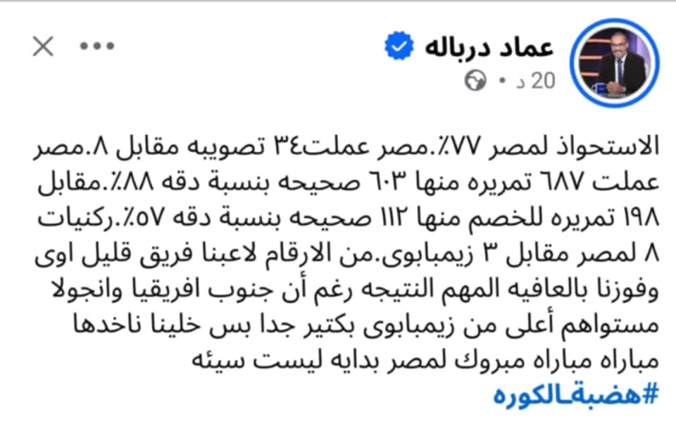 علق المحلل الرياضى عماد دربالة بالارقام والاحصائيات على فوز منتخب مصر الصعب على منتخب زيمبابوى منذ قليل.