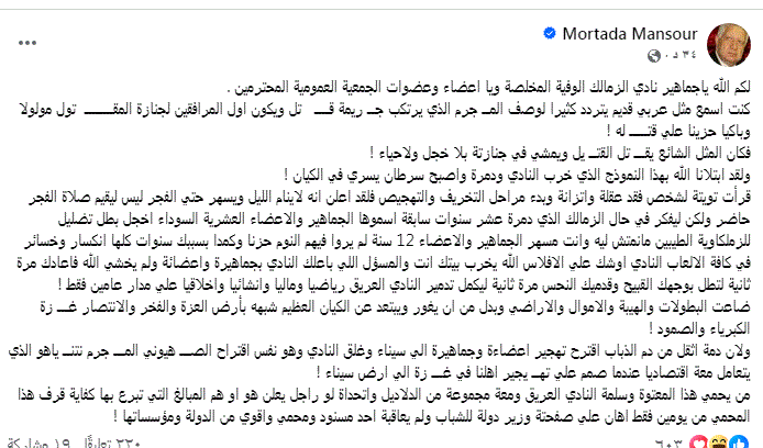 مرتضى منصور من خلال حسابه على موقع التواصل الاجتماعي فيسبوك كتب قائلا: