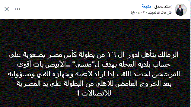 اسلام صادق من خلال حسابه على موقع التواصل الاجتماعي فيسبوك قائلا: