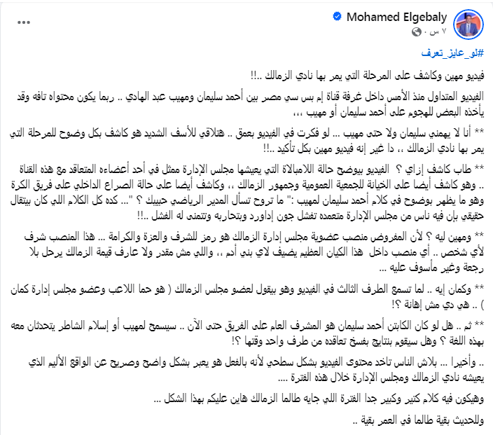 علق الناقد الرياضى محمد الجبالى على الفيديو المسرب لـ أحمد سليمان عضو مجلس الادارة مع المذيع مهيب عبد الهادى.