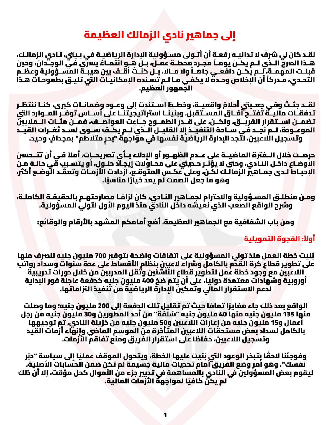 أضع هذه الحقائق كاملة أمام جماهير نادي الزمالك، احترامًا لوعيكم، وإيمانًا راسخًا بحقكم الأصيل في المعرفة. ومن هذا المنطلق، أوجّه دعوة صريحة وواضحة إلى جميع المسؤولين، وليس إلى مجلس إدارة النادي فقط: