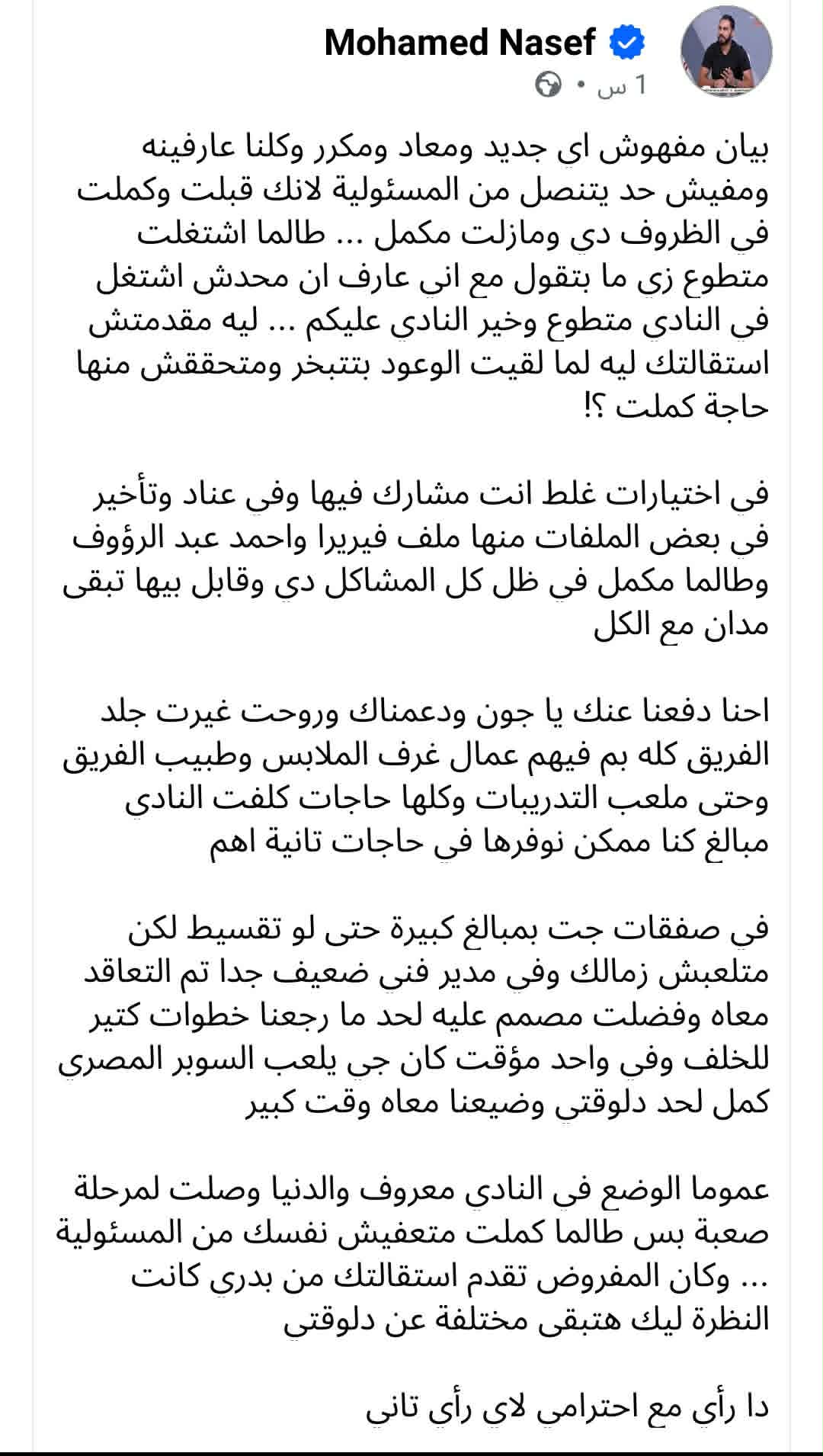 بيان مفهوش اي جديد ومعاد ومكرر وكلنا عارفينه ومفيش حد يتنصل من المسئولية لانك قبلت وكملت في الظروف دي ومازلت مكمل ... طالما اشتغلت متطوع زي ما بتقول مع اني عارف ان محدش اشتغل في النادي متطوع وخير النادي عليكم ... ليه مقدمتش استقالتك ليه لما لقيت الوعود بتتبخر ومتحققش منها حاجة كملت ؟!