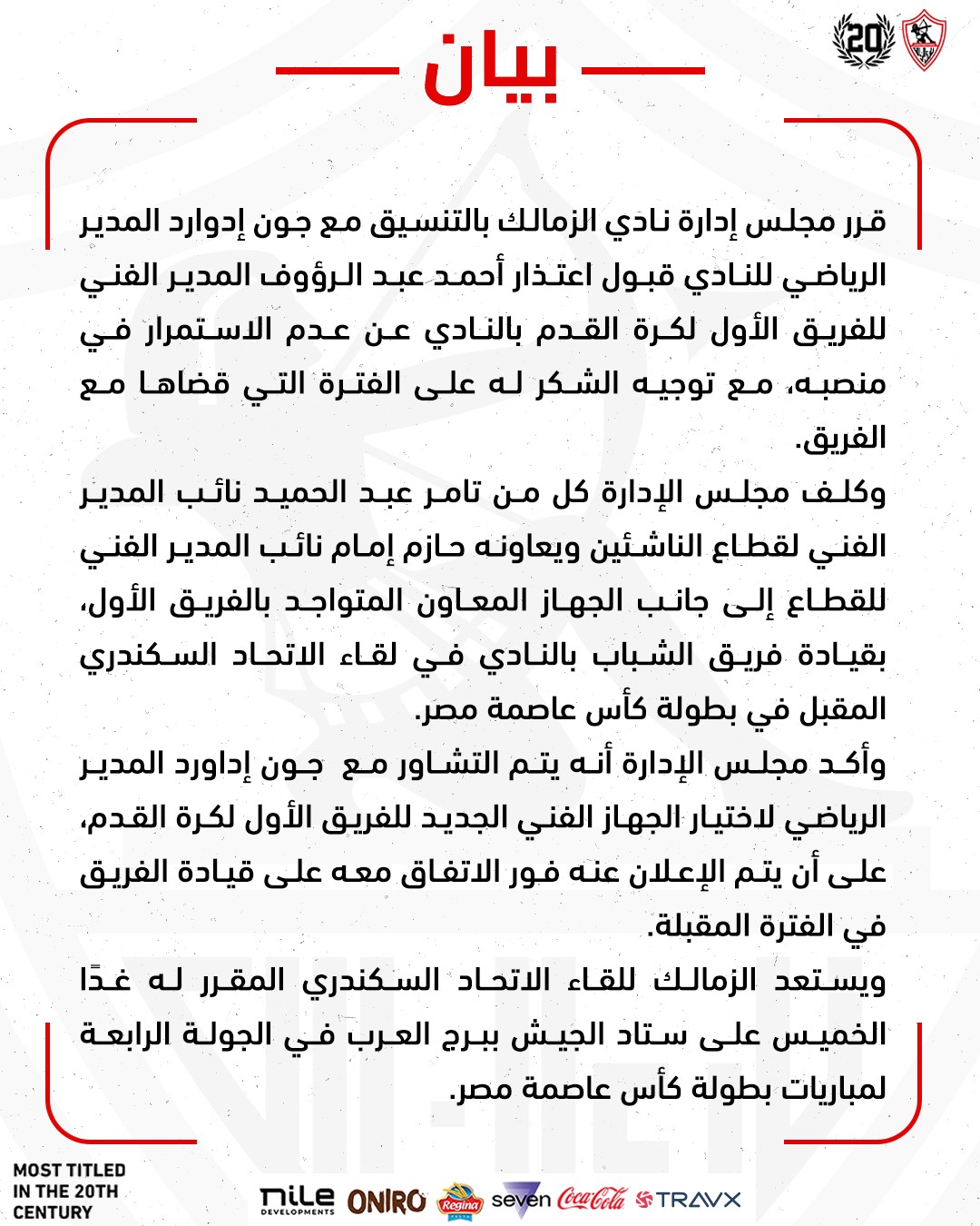 أعلن مجلس إدارة نادي الزمالك بالتنسيق مع جون إدوارد المدير الرياضي للنادي قبول اعتذار أحمد عبد الرؤوف المدير الفنى السابق للفريق عن عدم الاستمرار في منصبه كمدير فني للفريق الأول لكرة القدم.