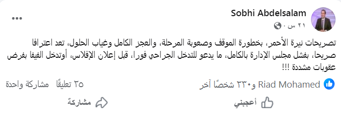وتابع : ما يدعو للتدخل الجراحي فورا، قبل إعلان الإفلاس، أوتدخل الفيفا بفرض عقوبات مشددة !!!