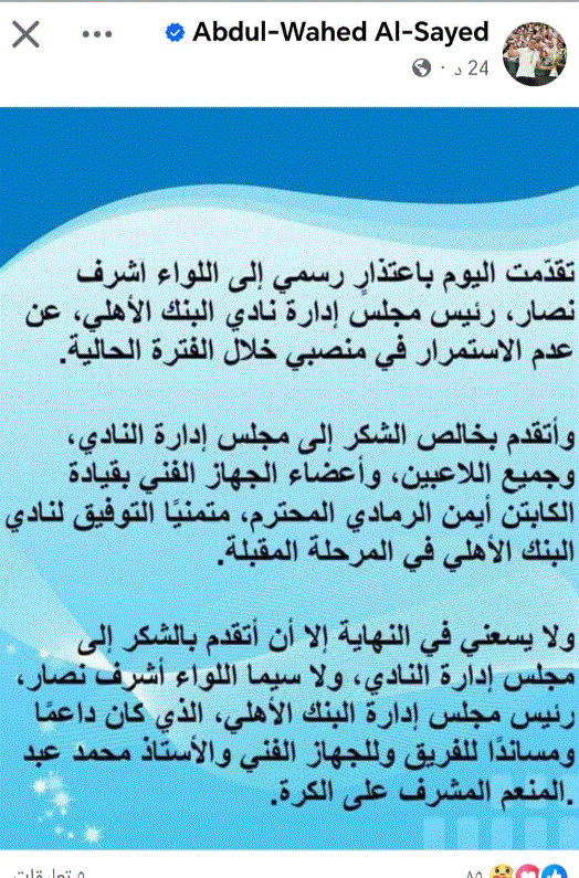 تقدمت اليوم باعتذار رسمي إلى اللواء أشرف نصار، رئيس مجلس إدارة نادي البنك الأهلي، عن عدم الاستمرار في منصبي خلال الفترة الحالية.