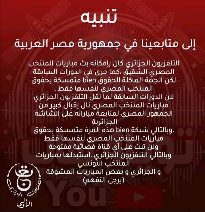 التلفزيون الجزائري كان بإمكانه بث مباريات المنتخب المصري الشقيق، كما جرى في الدورات السابقة، لكن الجهة المالكة للحقوق beIN متمسكة بحقوق المنتخب المصري لنفسها فقط.